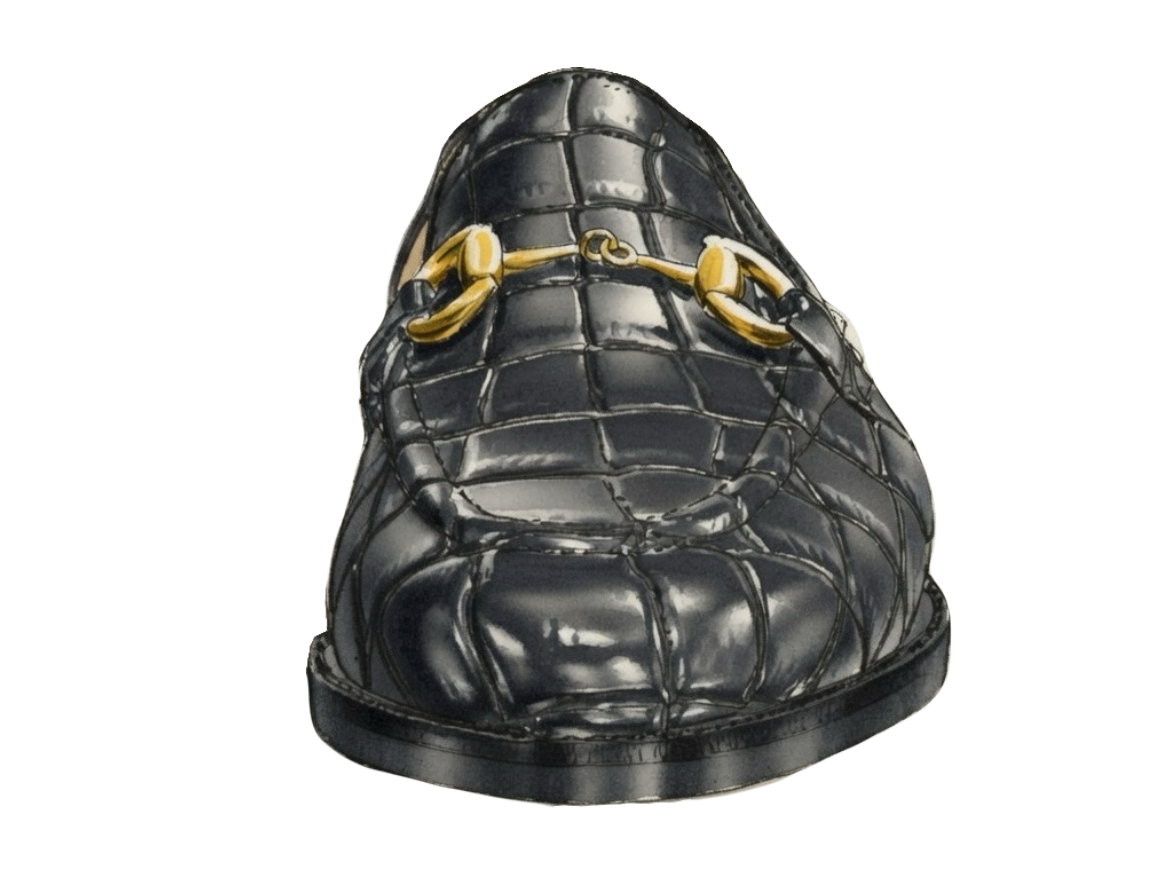 The Gustave is a simple, luxurious shoe that can be easily adapted to a formal or casual style. The embossed crocodile skin provides a unique, rugged echo, styled with a luxurious brass horsebit.