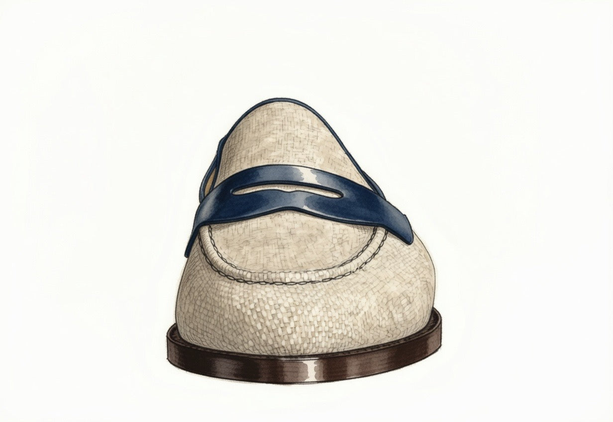 Designed for taking on the tropics, the Leopold is an ideal summer shoe. The structured linen body combined with a calfskin mask and trim creates a bold contrast for any summer look. An undeniable upgrade from the typical honey-tan derby or the atrocious sneaker-dress shoe hybrid, the loafer style of this far more elegant shoe fits perfectly in the slot of a more casual but dignified shoe style.